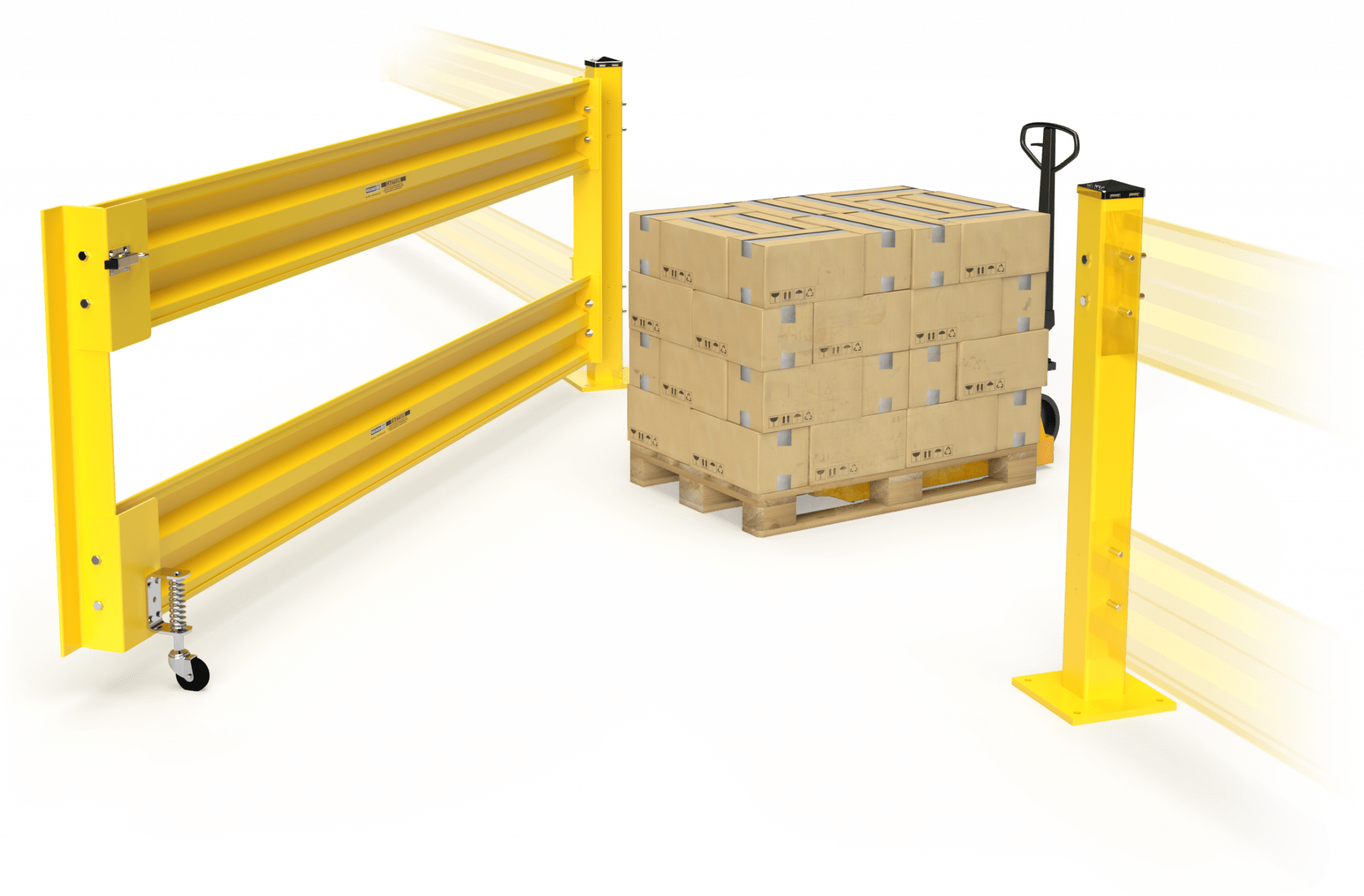 Personnel gates offer protection and access to individuals around guarded-off areas of the facility. These gates can be placed next to pallet gates or loading dock gates in order to provide a separate access way for your staff in conjunction to the loading dock or pallet gate which offers access to incoming and exiting materials.