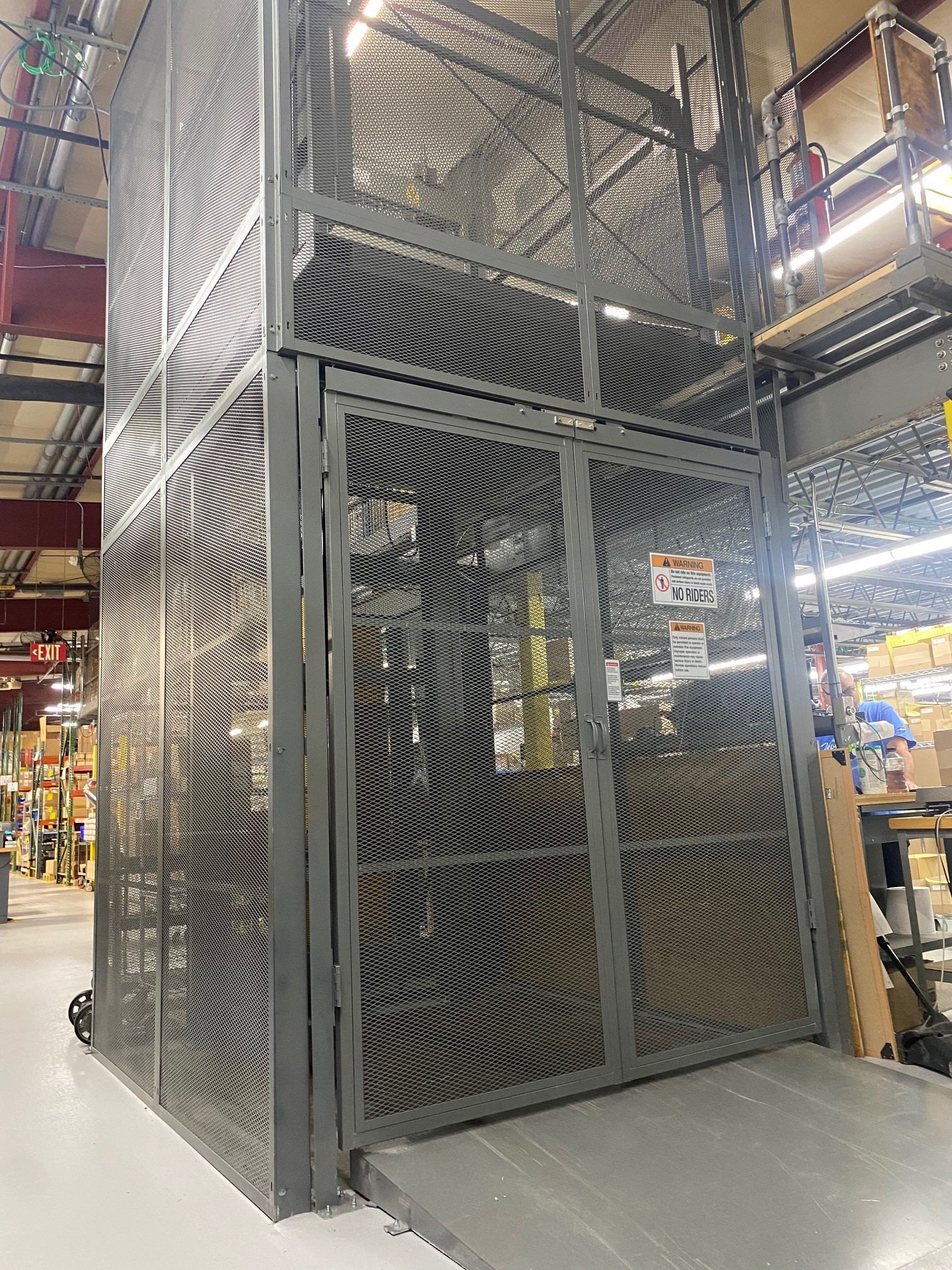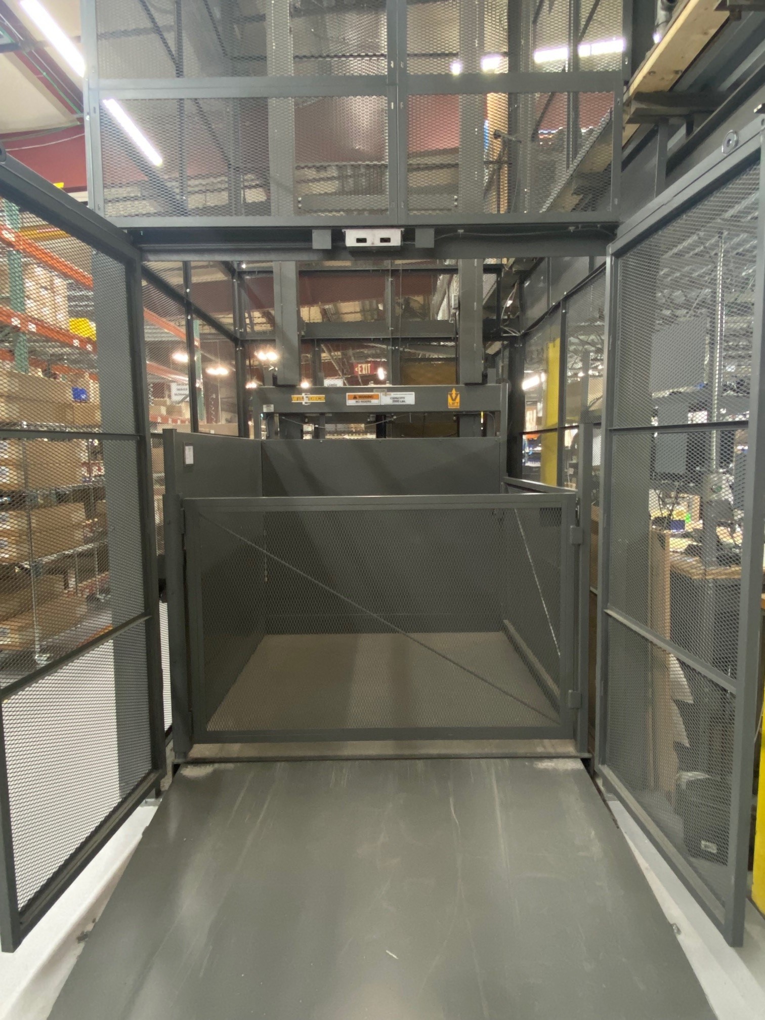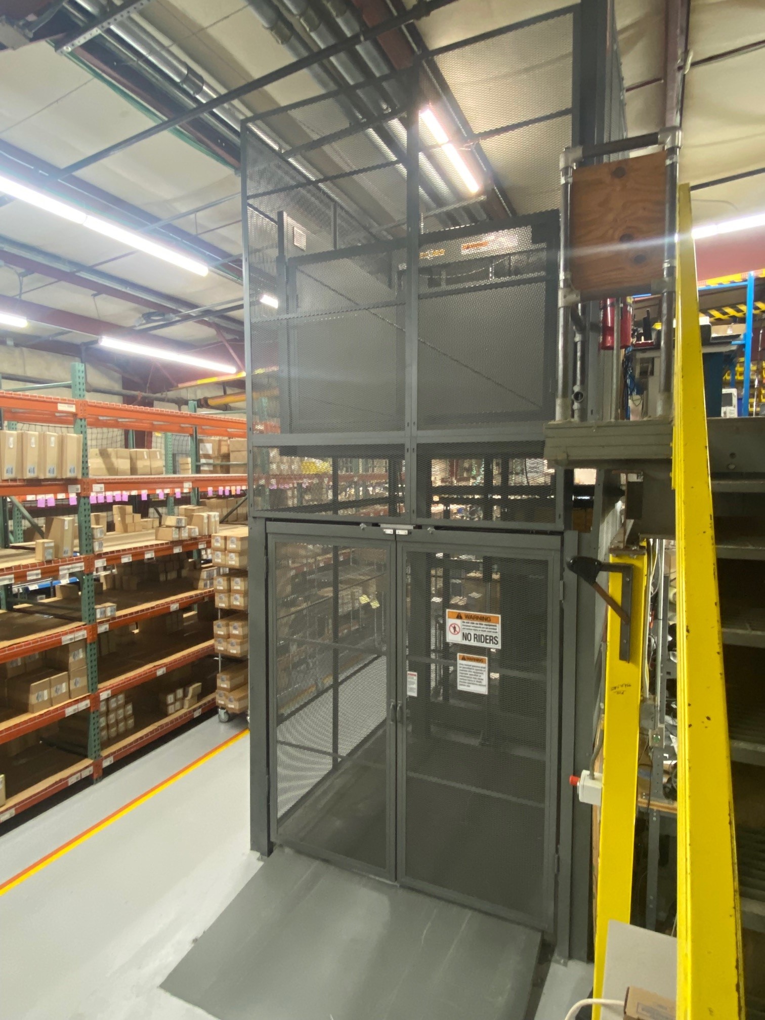 The new hydraulic VRC takes up about half of the floor space that the old inclined VRC. It can transport loads up to 2,000 lbs eliminating the need for fork truck usage by the loading docks. Additional lighting was also implemented as well as a control box room, adding safety and code compliance to the entire solution!